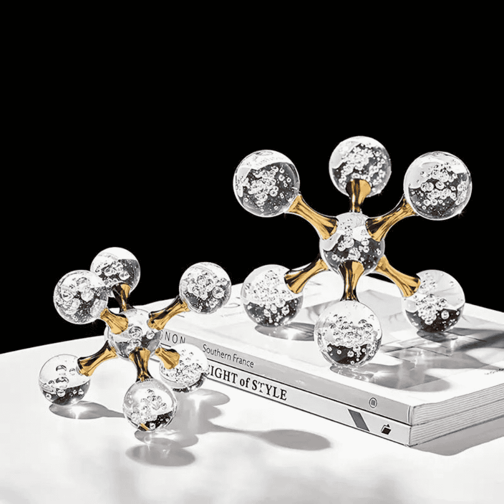The Crystal Orbit Decorative Sculpture is a luxurious duo of modern crystal art pieces designed to elevate your interior. With bubble-detailed glass spheres connected by a sleek golden hub, these sculptures bring balance and sophistication to any surface. Available in two sizes, they can be styled individually or as a complementary set.