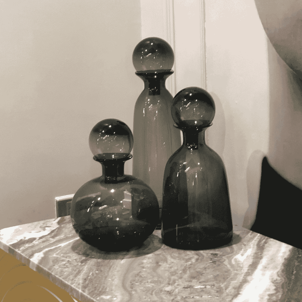 Made from hand-blown glass in a smoky gray hue, this set includes three decanters with unique shapes and matching globe stoppers. Sized at Large (40 cm), Medium (32 cm), and Small (25 cm), they serve beautifully as functional barware or as a refined decorative accent. Ideal for modern, sophisticated interiors.